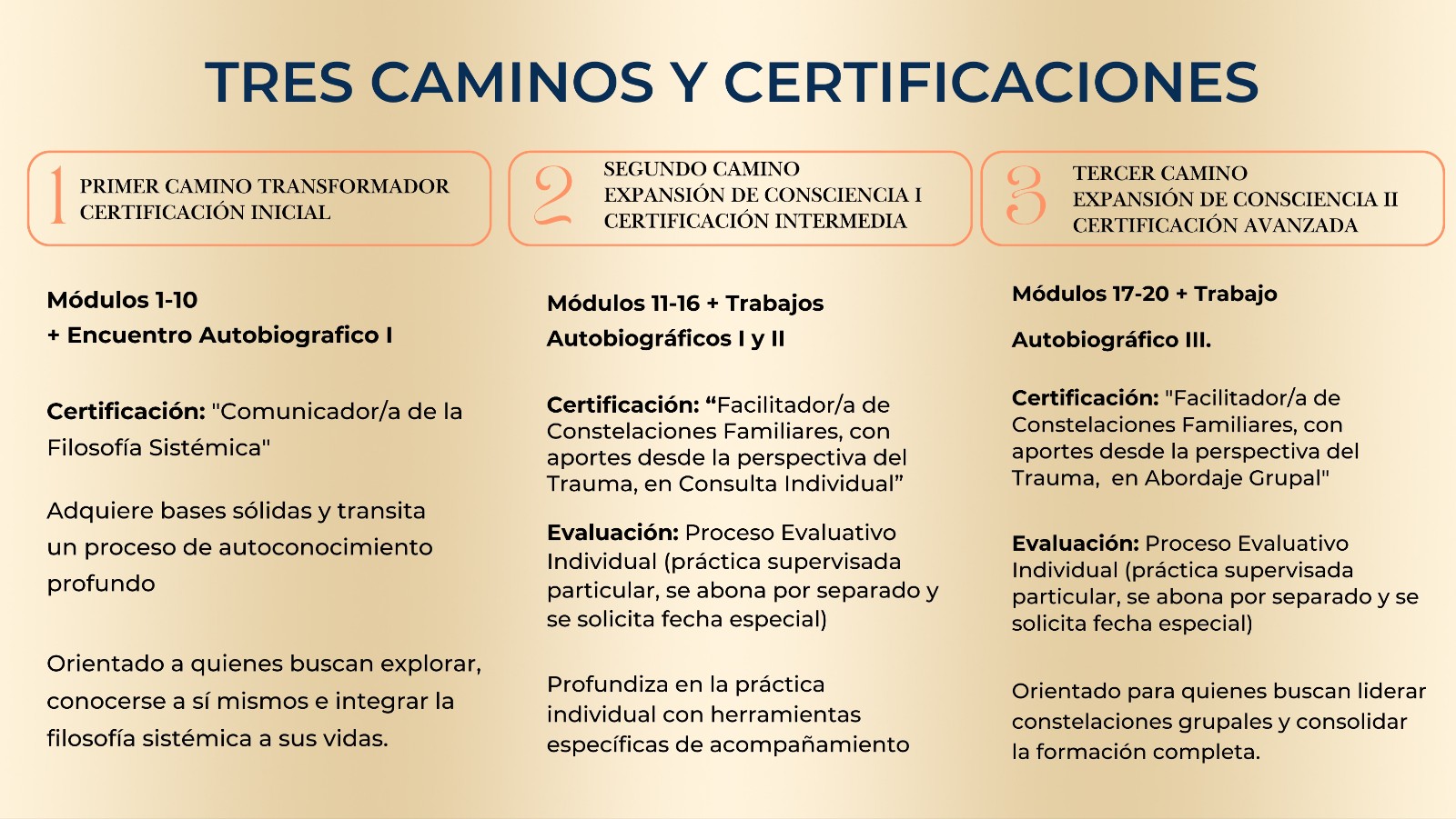 La formación en Constelaciones Familiares se organiza en tres caminos de aprendizaje y certificación, diseñados para acompañar distintos momentos, intereses y profundidades del proceso formativo.