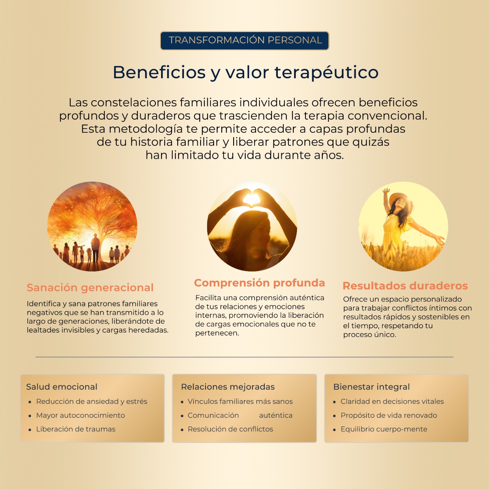 A lo largo del proceso se van revelando creencias, mandatos e implicancias sistémicas, con el objetivo de vivir de manera más libre, auténtica y alineada con el propio ser.